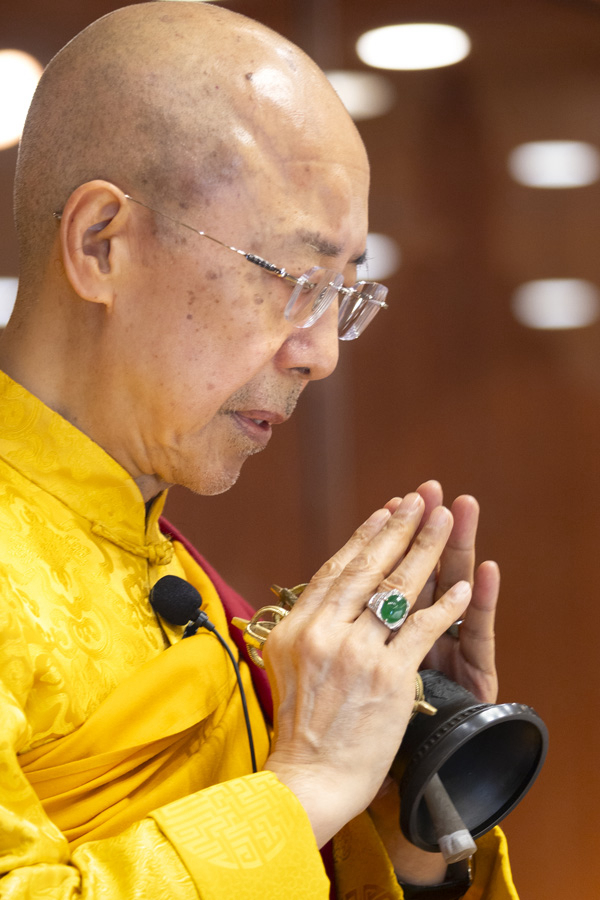 On the morning of August 31, at 9:15 a.m, His Eminence Vajra Guru Rinchen Dorjee Rinpoche performed the Dharma in the Vajra (Secret) Hall of the Glorious Jewel Buddhist Monastery, and simultaneously instructed the monastics to lead the disciples in chanting the Great Six-Syllable Mantra in the Mahavira Hall, beginning at 9:30 a.m. At 11:10 a.m., after completing the Dharma in the Vajra (Secret) Hall without taking any rest, Rinpoche immediately proceeded to the Mahavira Hall to check on the disciples’ chanting. Respectfully led by the dhavja, patākā, monastics, Eight Offering Girls, jeweled sitātapatra, musical instruments, and incense, Rinpoche ascended the Dharma throne and chanted the Great Six-Syllable Mantra.