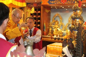 Then, Rinchen Dorjee Rinpoche performed the consecration ceremony for the one-thousand-hand and one-thousand-eye statue of Bodhisattva Avalokiteshvara and after that, enshrined it at the Glorious Jewel Buddhist Center.