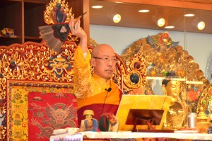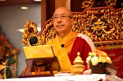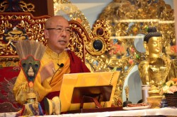 as the guru ascended to the Dharma throne. Before performing the Dharma, His Eminence Rinchen Dorjee Rinpoche disseminated the precious Dharma teachings: Many people in China, Korea, and Japan are very familiar with Bodhisattva Ksitigarbha. Unfortunately, they have not learned how to make offerings according to the Dharma. As such, Rinchen Dorjee Rinpoche explained in detail to the attendees the aspiration of Bodhisattva Ksitigarbha, the location of the Dharma performance and mandala, as well as the requirements for the presiding practitioner.