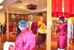 At the beginning of the Puja, the attendees put their palms together in respect to welcome His Eminence Rinchen Dorjee Rinpoche,