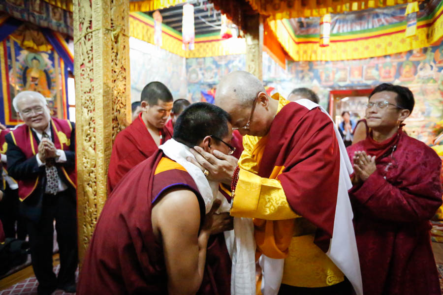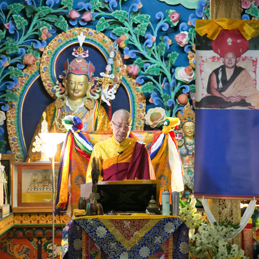 Led and escorted by incense burners, musical instruments, and a jeweled parasol, His Eminence Rinchen Dorjee Rinpoche walked along the flower-strewn white carpet of Eight Auspicious Symbols. After stepping up to the mandala, the guru prostrated himself respectfully before the Buddhas and Bodhisattvas and presented a khata to the wish-granting jeweled Dharma throne of His Holiness the Drikung Kyabgon Chetsang and His Holiness the Drikung Kyabgon Chungtsang, lit lamps as an offering to the Buddha, and finally ascended the Dharma throne to bestow precious Dharma teachings upon the attendees: