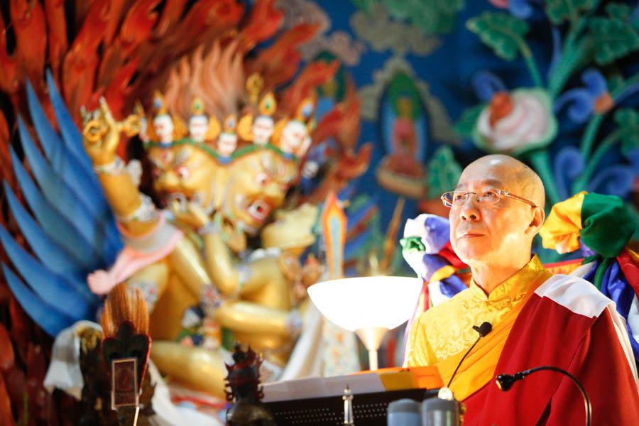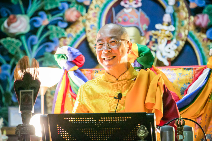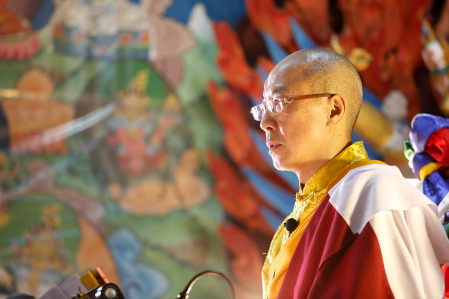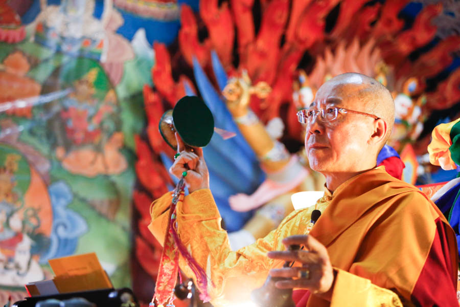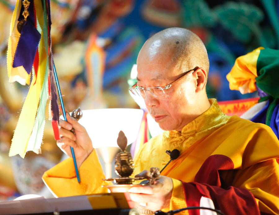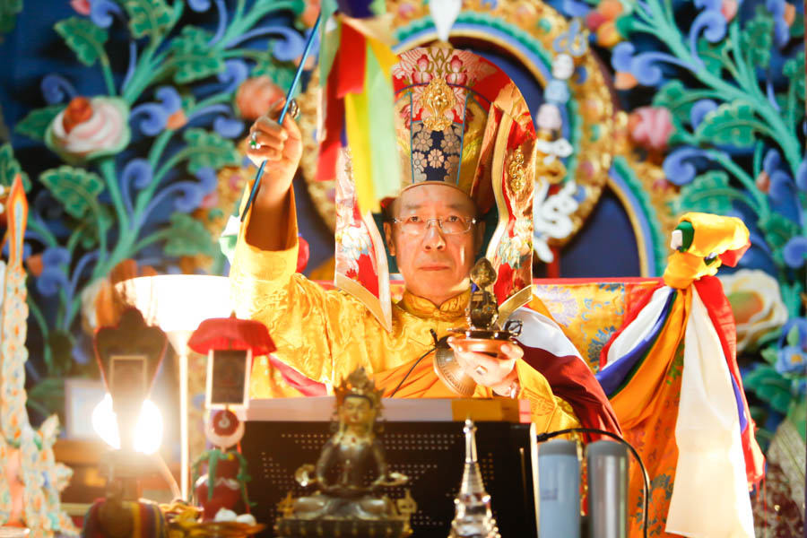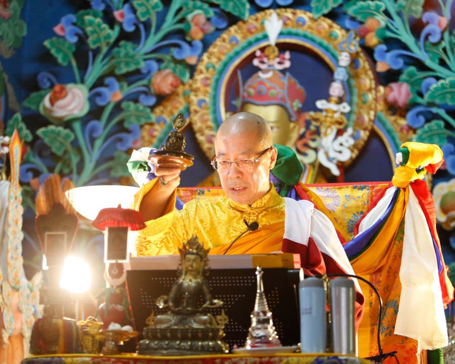 “If you have come to participate in today’s puja with a compassionate, repentant mindset, a resolve to become liberated from reincarnation in this lifetime, and respect for the Three Jewels, then this empowerment will certainly be of use to you. What does ‘empowerment’ mean? It is based on an ancient Indian tradition. Back then, whenever a king wanted to pass his crown on to a prince to become the country’s future monarch, a precious, treasured vase filled with purified water would be used. The water was then poured from the top of the prince’s head, indicating that the lineage had been passed on to him. Thus, ‘empowerment’ means that after you are empowered, the yidam has given you the authority to practice this Dharma. Someone is sure to ask, ‘So can I chant this mantra even if I’m not empowered?’ Of course you may, but you will not achieve attainment in it, because the yidam has not given you the authority to do so. It would be like a student wishing to go to school: He or she needs to register first, right? The teachers cannot begin to teach that student until they know who he or she is.