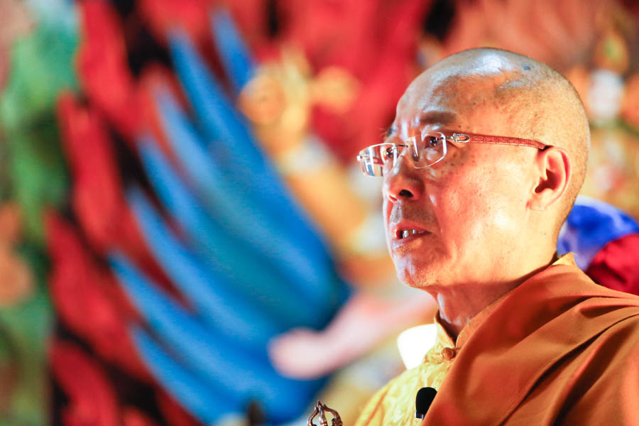 “Next, we will perform the Avalokiteshvara Offering. The Great Six-Syllable Mantra is the essence of all Tantric mantras, and to cultivate it one must first receive empowerment and oral transmission of it from one’s guru; in addition, one must integrate the generation and completion stages into one’s practice. Unless we undergo this learning process, we are simply mouthing this mantra with our greed, hatred, ignorance, arrogance, and doubt; as such, it will be useless. One of the Vajrayana pith instructions tells us that while chanting mantras, we can integrate the generation and completion stages, meditate, and cultivate diligently, then we will be able to become liberated in body, speech, and mind; and that if this fails, then it means Vajradhara was a liar. In other words, therefore, by cultivating in this manner we can definitely achieve liberation in this lifetime.