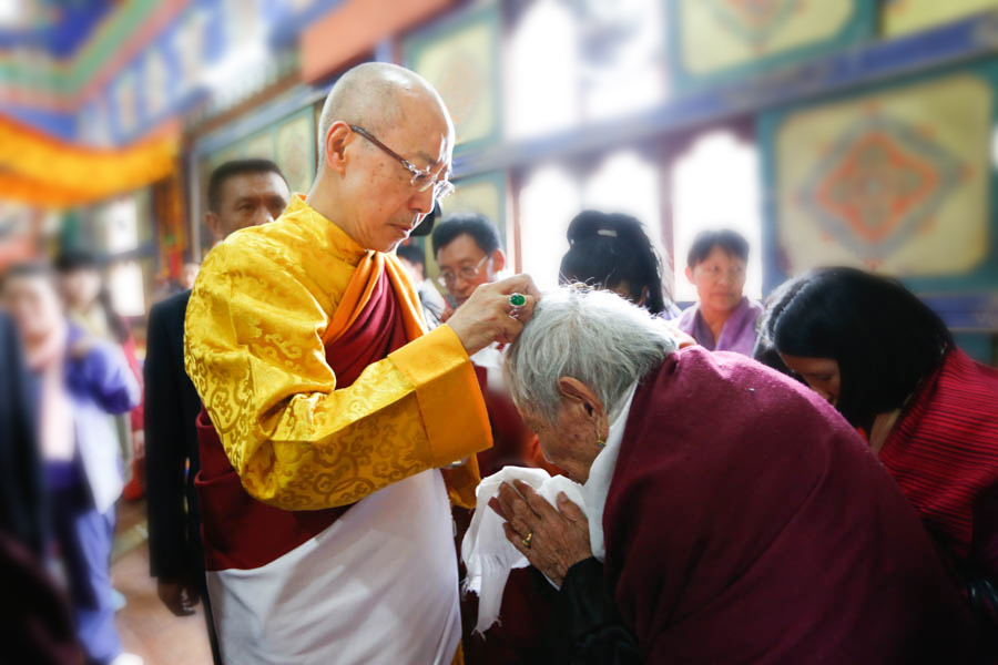 Rinchen Dorjee Rinpoche blessing the Drikung Kyabgon Chetsang’s aunt (wearing yellow) after the perfect completion of the puja.