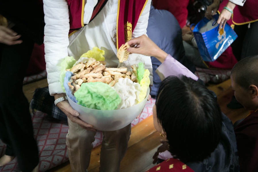 Then, while performing the Tsok, each of the attendees received offering items that had been blessed by Rinchen Dorjee Rinpoche as well as the rare and auspicious causal condition to partake food with the Buddhas and Bodhisattvas during the puja.