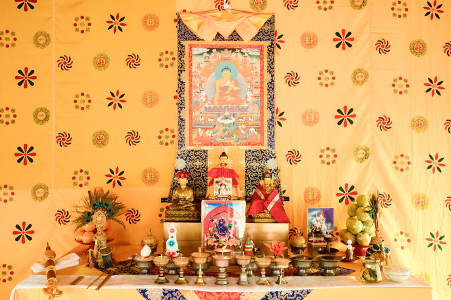 “In the Drikung Kagyu Order, Acalanatha’s form is one of kneeling down on his left knee, but not his right. On both his legs are pressing down the demons of affliction, death, the heavens, and illness. This means that by cultivating this yidam, we can subdue all four of these demons, thereby lessening any hindrances to our practice. This is why we are praying to Acalanatha as our main yidam during today’s fire offering.