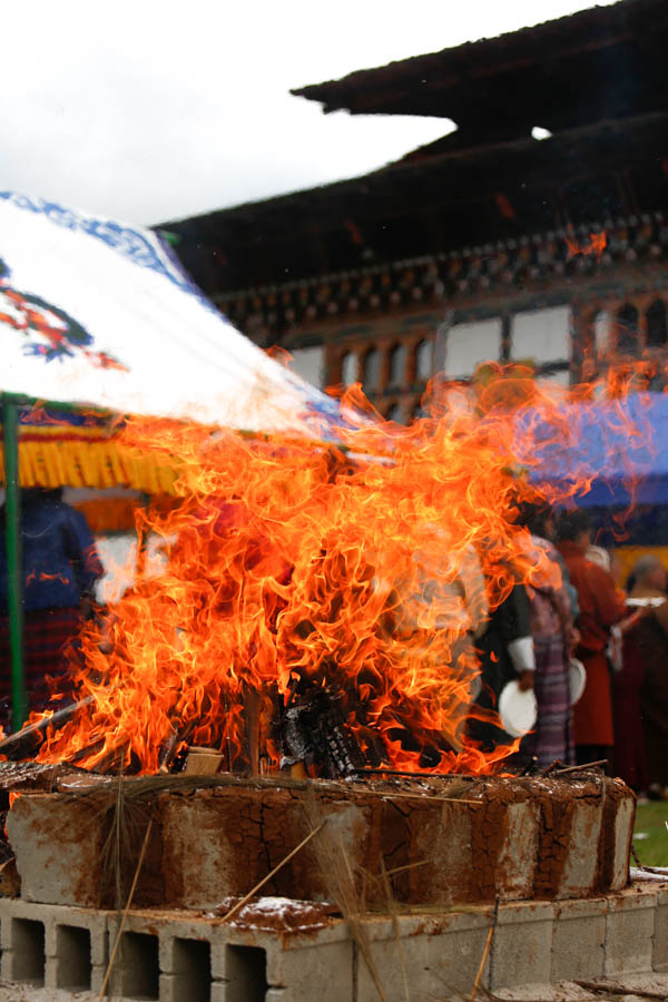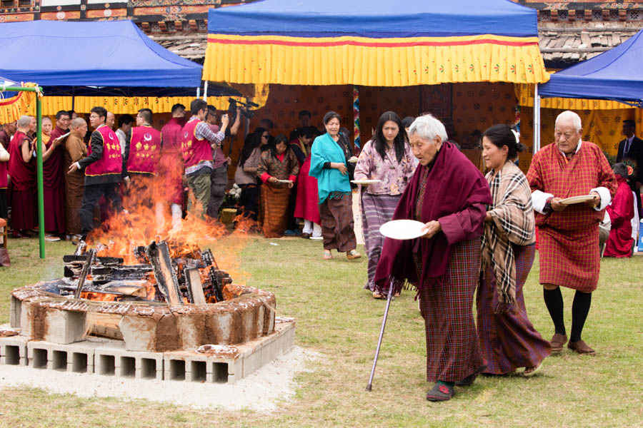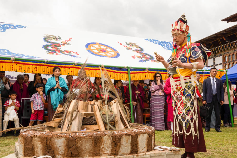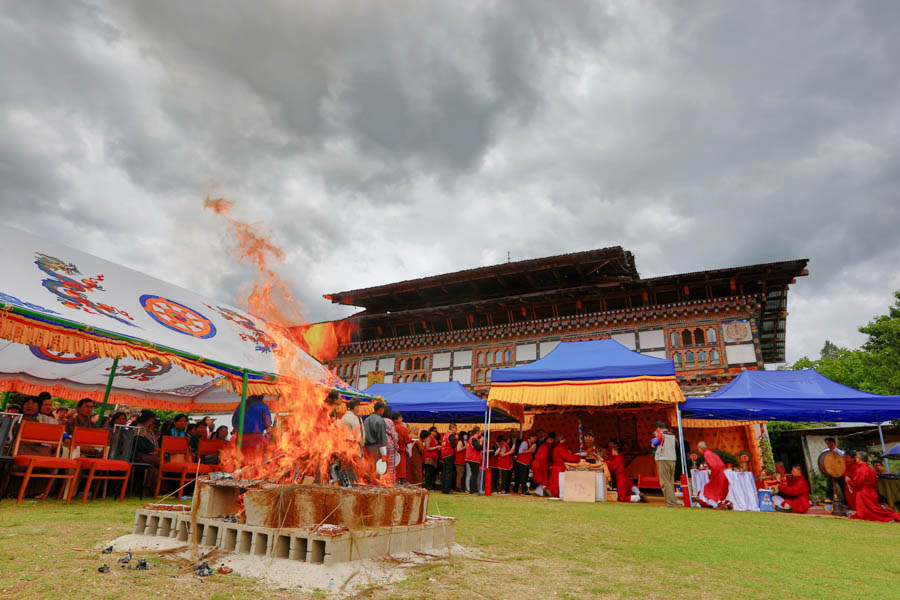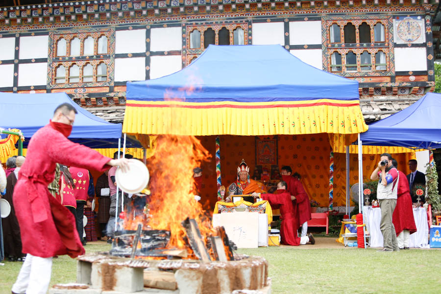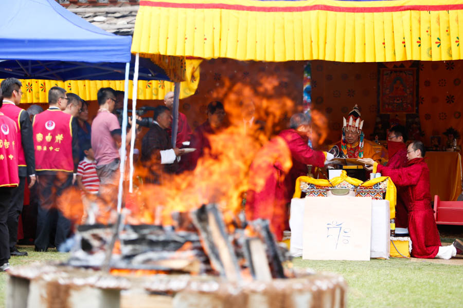 “I will be performing a Tibetan Buddhist Fire Offering for sentient beings here in the Gangtey Palace gardens. It is written in the Buddhist Canon that fire offerings are divided into three mandalas of varying sizes. The one being held today is the fire offering of the large mandala. Fire offerings include four Dharmas—subduing, placating, increasing, and vanquishing—and today I will be performing the fire offering of subduing.