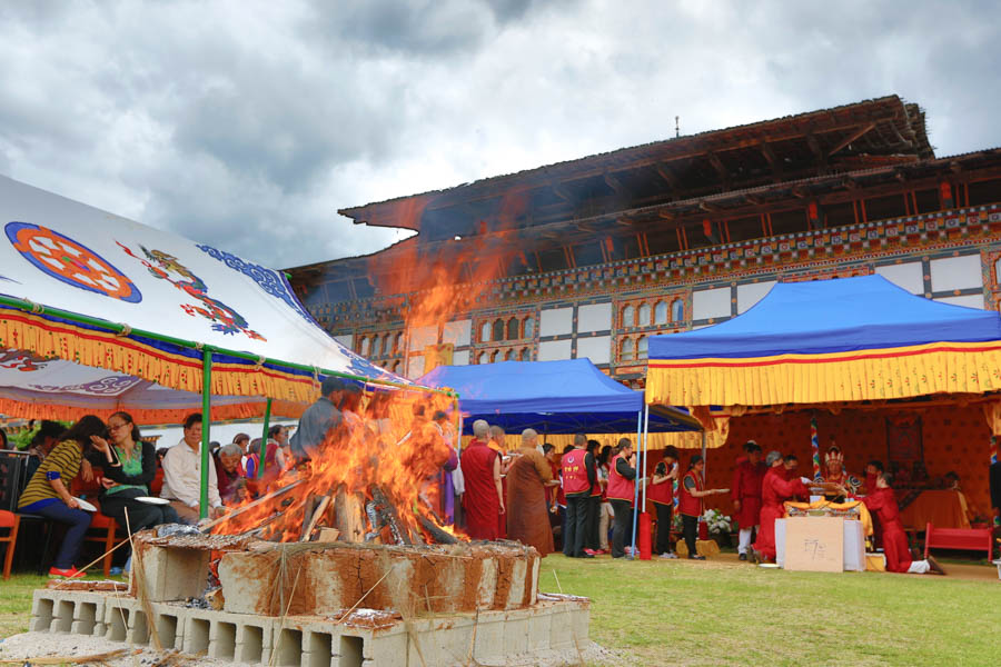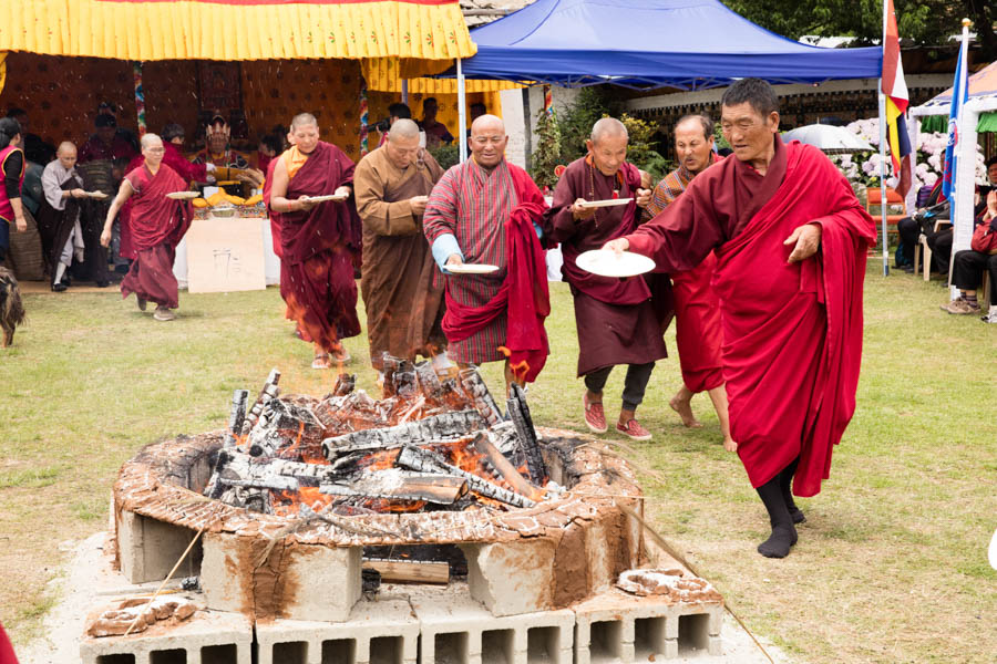 “Every time a fire offering is performed, it requires a great deal of human, financial, and material support, as well as aspired benefactors. For all this I offer my heartfelt gratitude to the Dorji family, who have organized everything very well indeed. All of the pujas I have performed here in Bhutan over the past three days have gone smoothly and come to a perfect completion. I hope that this family will continue to protect and support the Dharma through lifetime after lifetime, and accumulate a great amount of good fortune and wisdom. The virtuous karma produced by these pujas can also be shared by all of you Bhutanese believers who have attended; whether you came here to get some exercise or to participate in the pujas, you all have a share in this good karmic effect. May the Buddhas and Bodhisattvas continue to protect this land and its king. Thank you!”
