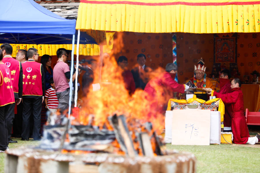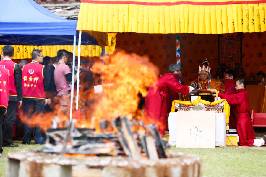 “The special characteristic of the fire offering is that it involves imploring the yidam to approach the mandala, as well as fire deities and Dakinis, so that by way of this medium we can make offerings to the Buddhas and Bodhisattvas in the Ten Directions and give alms to all sentient beings. In this ritual, various offering items are tossed into the mandala as offerings, each of which has its own special significance and function. Some offering items are used to reduce suffering caused by illness, while others can help us increase our wealth.