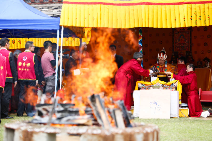 During the ritual, the mandala’s flames flickered and danced, at times a meter high, looking as though the fire deities had come down to make an appearance. The fire transformed continuously into all sorts of auspicious signs, emitting a booming sound as they burned fiercely. When the puja was over, all of the esteemed Bhutanese guests voiced their praise and joyous, overflowing gratitude together in Chinese: “We thank you, Rinpoche!” Next, His Eminence Rinchen Dorjee Rinpoche led the attendees in a recitation of the Aspiration Prayer for Rebirth in Amitabha’s Pure Land. The guru’s compassionate voice echoed across the entire mountain valley, blessing countless sentient beings all around.