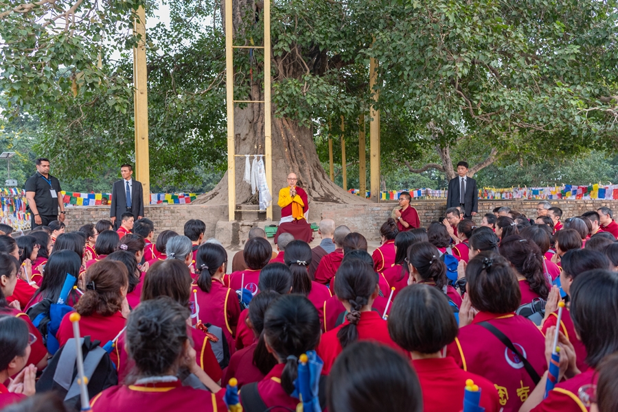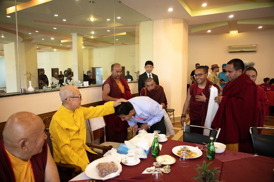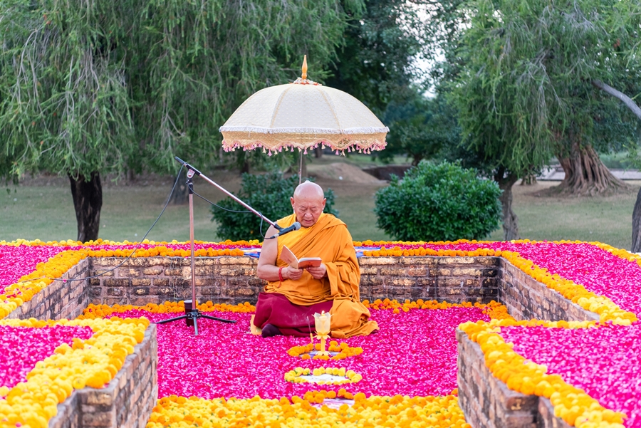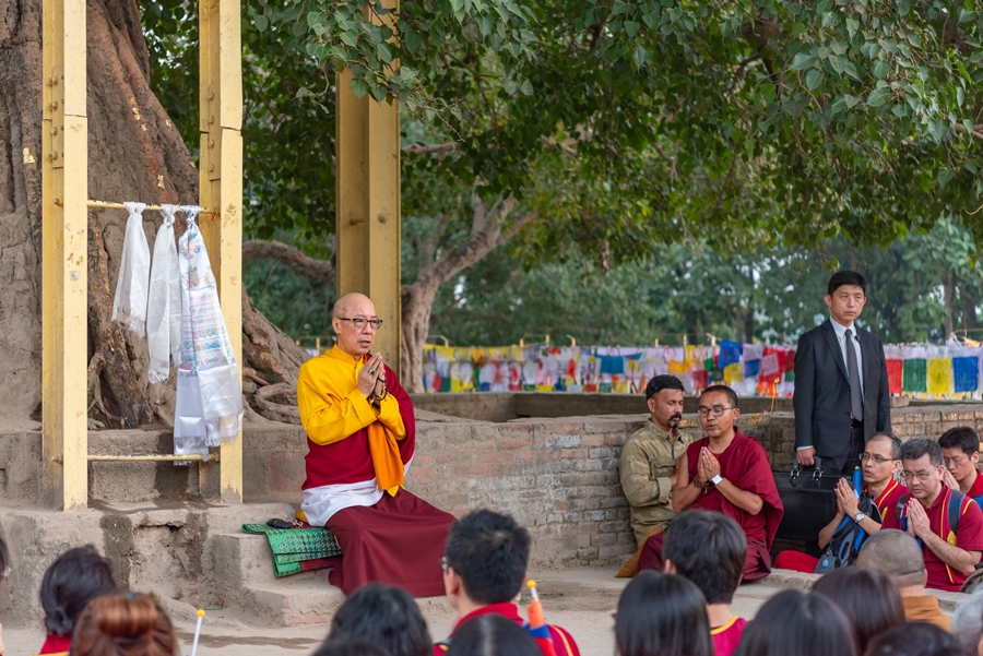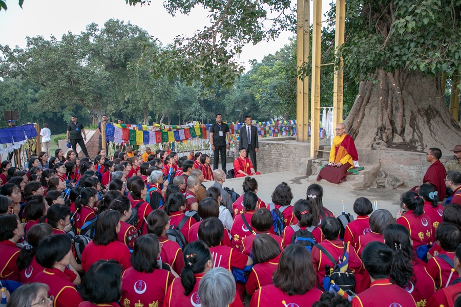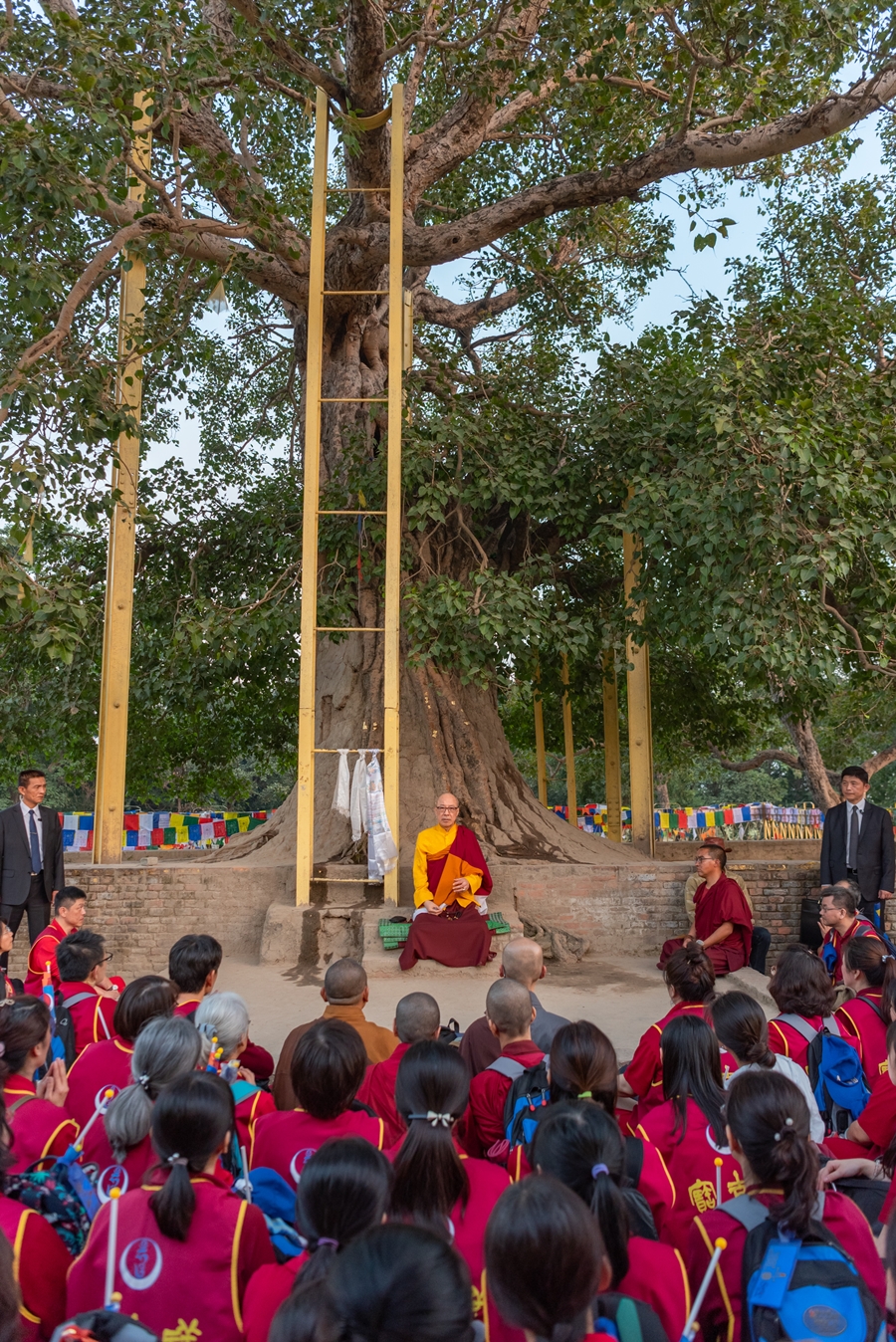 2018年10月29日から11月4日まで、寶吉祥の弟子は幸運にも、尊勝なる直貢チェ・ツァン法王、尊きリンチェンドルジェ・リンポチェの仏法開示を拝聴でき、また二人の大修行者に従い、祇樹給孤独園へ赴き、仏陀安居処にて求生極楽浄土文を唱誦することができた。新しい寺の大殿内で、リンポチェは自ら弟子を率い六字大明咒を持誦しながら繞仏なさった。祇園の大菩提樹下で、リンポチェは弟子を率い坐禅を組み、あたかも済度した衆生に仏陀が法音を宣流なさった当時のようだった。多くの者達がリンポチェに従い仏陀の足跡を追いながら、上師の心遣いを感じ、遍く満ちる上師の慈悲加持力を改めて知った。