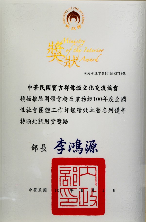 「社團法人中華民國寶吉祥佛教文化交流協會」,在協會住持上師——尊貴的 仁欽多吉仁波切親自教導、帶領及監督之下,榮獲內政部「100年度全國性社會暨職業團體工作評鑑」之優等社團。全國性社會暨職業團體總數為10,298,本項評鑑分優等、甲等、乙等三個等次,而本協會獲得優等之最高榮譽,感恩尊貴的金剛上師 仁欽多吉仁波切。