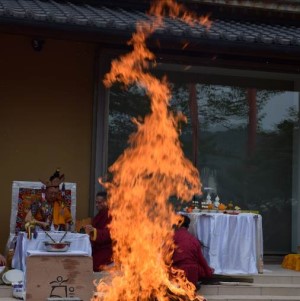 修法過程中,火供壇城的火勢極為猛烈,火焰直衝至二樓的高度,熊熊烈火像是突然間有了生命,勢不可擋,密法的殊勝難以想像。隨著尊貴的 仁欽多吉仁波切的修法,壇城中的火焰如同火神降臨,火焰不斷顯現出各種變化的瑞相。