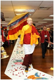下午2點,尊貴的 仁欽多吉仁波切在薰香爐、樂器、寶傘的前導及迎請下,行經灑滿鮮花的八吉祥白地毯步上壇城,恭敬頂禮諸佛菩薩,並向尊勝的 直貢澈贊法王如意寶法座獻哈達、點燈供佛,而後升法座。