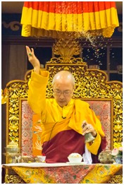 尊貴的 仁欽多吉仁波切開始修法,在每段修法的過程中,皆深入淺出地開示修法的儀軌及意義。仁欽多吉仁波切開示,前面所唸的是發心、發願與介紹阿彌陀佛的淨土、宮殿,以及上師與本尊無二無別。再修一次是恭請法身的本尊到壇城接受八供的供養,每一個供養都有其含意,如:供養音樂,是供養一切善知識、如來與眷屬,恆常供養,而且是以恭敬心供養,希望賜予殊勝佛果位。供養不是為了發財、身體好,是為了要成佛,只要做過供養,未來有一世一定能成佛果。接下來,要繼續供養。剛才前面所修的全部都是供養,為什麼需要供養呢?就是要幫助自己與眾生累積福報。每個供養都有其含意,比如說供燈就能除掉一切黑暗,變成光明充滿無邊的虛空,供養是很重要的。