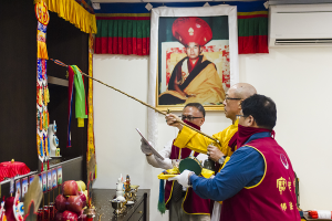 修法過程中,尊貴的 仁欽多吉仁波切以極為慈悲的眼神不斷加持、救度虛空中的無數眾生,饒益一切有情。接著,帶領與會大眾修持觀音菩薩簡軌,恭誦六字大明咒良久,並修持阿奇護法儀軌。圓滿開光儀軌之後,尊貴的 仁欽多吉仁波切為辦事處每一間房室、每一個角落灑淨,關心辦事處的事務,並如父母般細心叮嚀弟子們須留意之處。