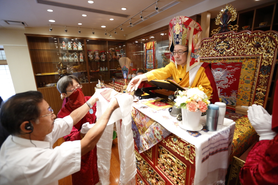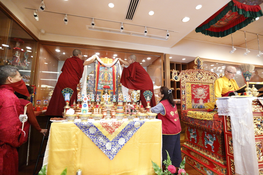 仁欽多吉仁波切指示與會大眾右膝長跪,由出家眾代表眾生燃香供佛,恭迎地藏王菩薩蒞臨壇城。接著,仁欽多吉仁波切祈請地藏王菩薩降臨至唐卡,並指示出家弟子代表眾生向壇城主尊地藏王菩薩唐卡敬獻哈達。