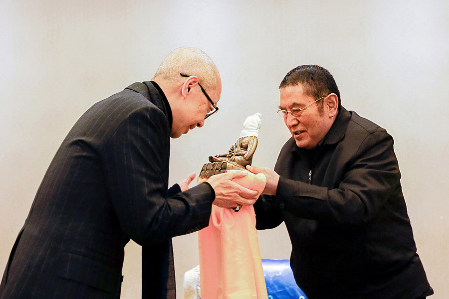 下午2點30分,尊勝的 直貢瓊贊法王在 仁欽多吉仁波切的隨侍下,接見寶吉祥佛法中心弟子。尊勝的 直貢瓊贊法王賜贈 仁欽多吉仁波切直貢噶舉的皈依境唐卡、建造不丹鐵橋的唐通.杰布尊者聖像,以及今年直貢梯寺法王大法會的紀念品。