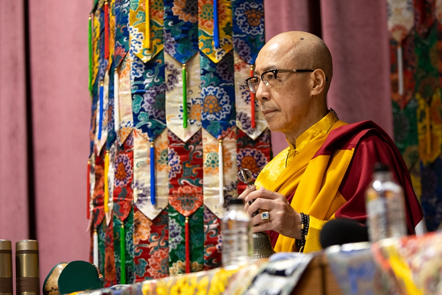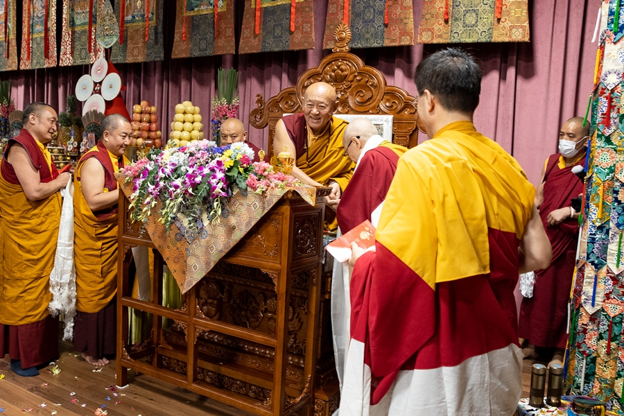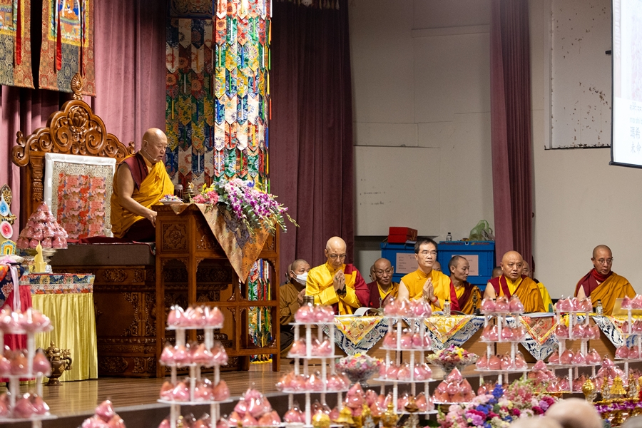 全球直播的法會準時於下午2點鐘開始。尊勝的 直貢澈贊法王升法座後,尊貴的 仁欽多吉仁波切站在第一位向 法王頂禮。之後,尊貴的 仁欽多吉仁波切坐在 法王法座左手邊第一個最上首的位置。傳統上,左邊為大,左側第一位,也就是最上首的位置。