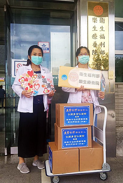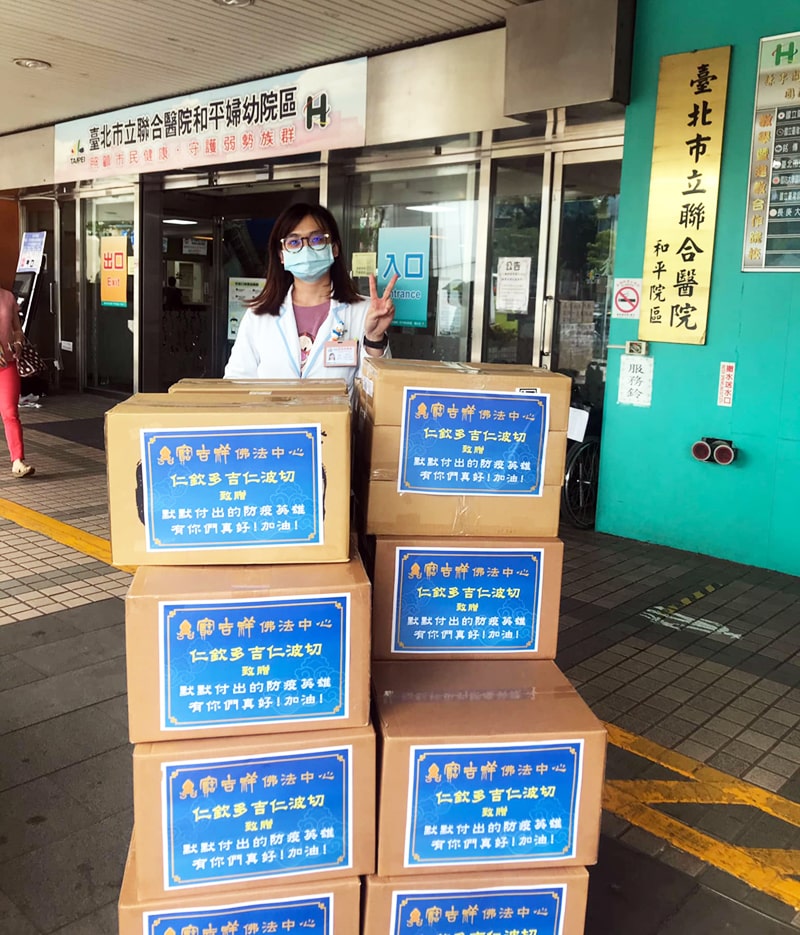 尊貴的 仁欽多吉仁波切致贈上千箱豆漿及蔬食等物資,裝載物資的箱子上特別註明「有你們真好!加油!」,給予前線防疫人員鼓勵與支持。