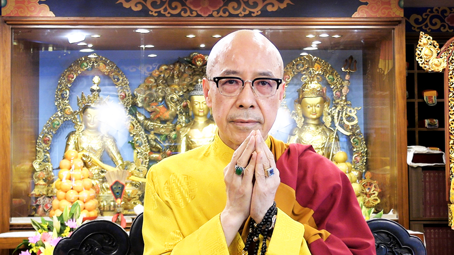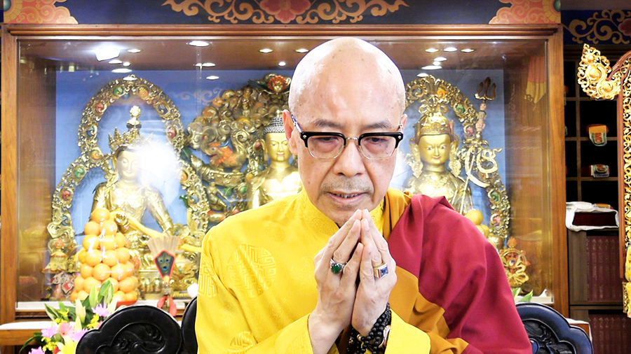 尊貴的 仁欽多吉仁波切在寶吉祥佛法中心以視訊方式受邀致詞,仁波切向尊勝的  直貢澈贊法王賀壽: