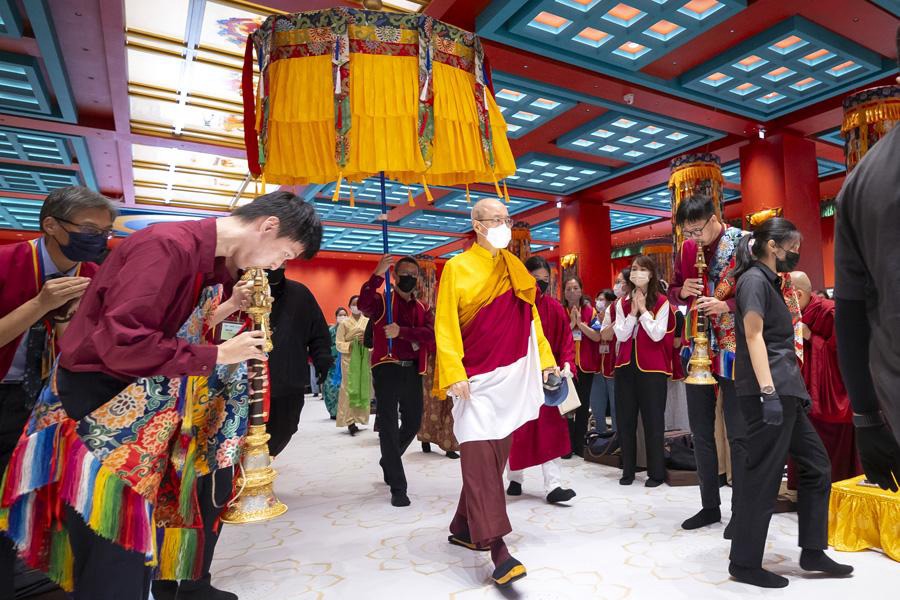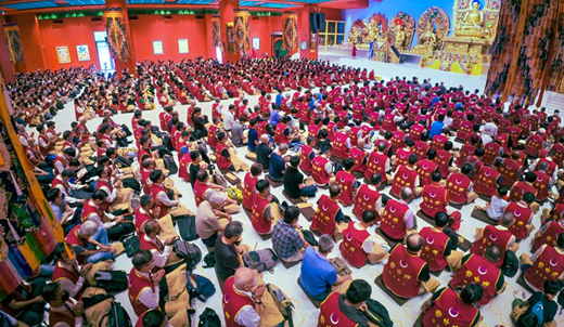 8月31日上午9點15分,尊貴的 仁欽多吉仁波切於寶吉祥 仁欽多吉仁波切佛寺密殿修法,同時指示出家眾帶領弟子於上午9點30分開始,於大殿持誦六字大明咒。11時10分,仁波切於密殿修法後,未作片刻歇息,隨即前往大殿,關心弟子們持咒的狀況。仁波切在幡、幢、出家眾、八供女、寶傘、樂器、薰香的前導迎請下,升座持誦六字大明咒。