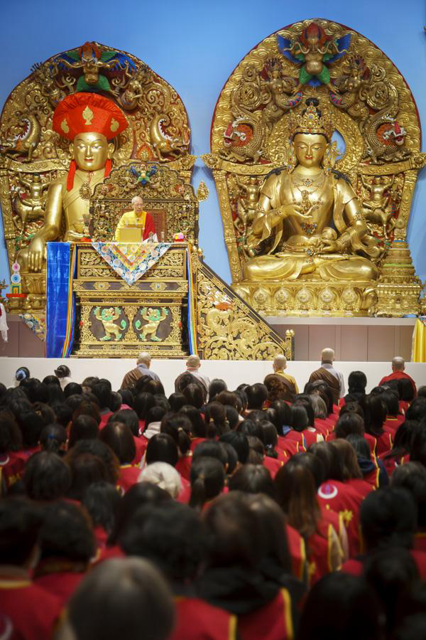8月31日上午9點15分,尊貴的 仁欽多吉仁波切於寶吉祥佛寺密殿修法,同時指示出家眾帶領弟子於上午9點30分開始,於大殿持誦六字大明咒。11時10分,仁波切於密殿修法後,未作片刻歇息,隨即前往大殿,關心弟子們持咒的狀況。仁波切在幡、幢、出家眾、八供女、寶傘、樂器、薰香的前導迎請下,升座持誦六字大明咒。