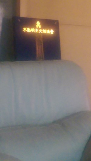 當天中午她將客廳的燈都關掉,坐在沙發上,突然感覺眼角有光,她轉身一看,放在沙發上端的不動明王火供的相本封面上的那一排金字竟然在發光,當時她沒開燈。看到那個場景她非常的歡喜及感恩,感恩金剛上師所給予我們的都是寶,連不動明王火供法會的相本都能安定她這顆急迫的心,也能讓一位沒有學佛、即將往生的母親能對金剛上師 仁欽多吉仁波切產生恭敬心,再再示現金剛上師 仁欽多吉仁波切所做的任何一件事都只有以利益眾生的方向去考慮,完全沒有任何一絲一毫的利益考量。