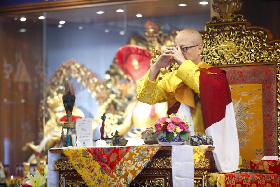 下午2點15分,尊貴的 仁欽多吉仁波切再次升法座,帶領與會大眾念誦《百遍頂禮證知》,接著修大象財神法。