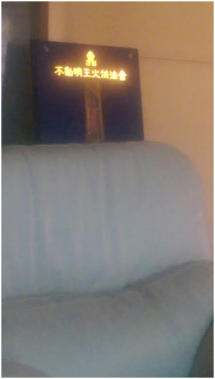 當天中午我將客廳的燈都關掉,坐在沙發上,突然感覺眼角有光,我轉身一看,放在沙發上端的不動明王火供的相本封面上的那一排金字竟然在發光,當時我沒開燈。看到那個場景我非常的歡喜及感恩,感恩金剛上師所給予我們的都是寶,連不動明王火供法會的相本都能安定我這顆急迫的心,也能讓一位沒有學佛、即將往生的母親能對金剛上師 仁欽多吉仁波切產生恭敬心,再再示現金剛上師 仁欽多吉仁波切所做的任何一件事都只有以利益眾生的方向去考慮,完全沒有任何一絲一毫的利益考量。