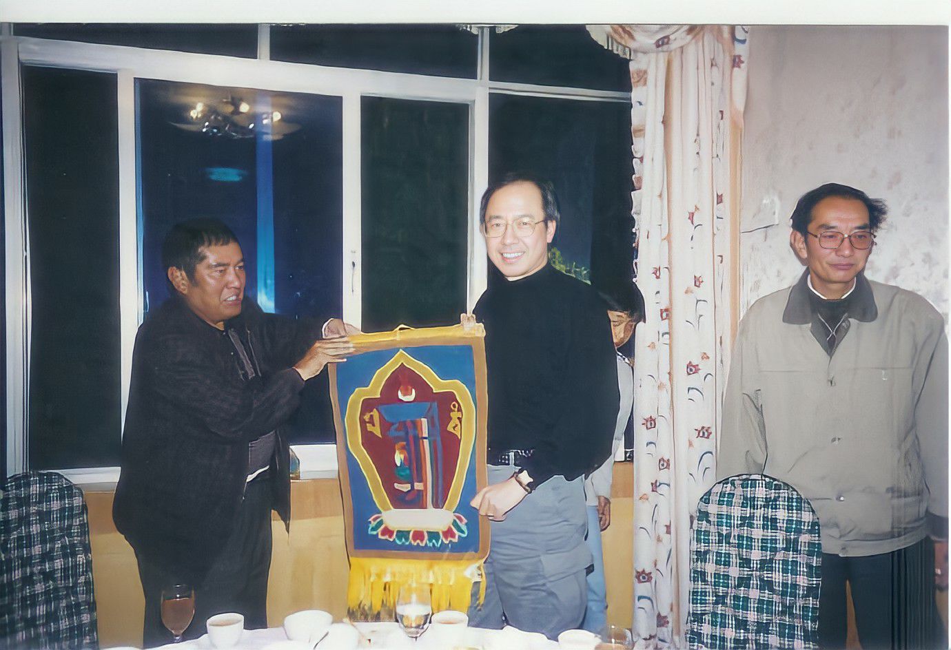 2002年在西藏晚宴時,直貢瓊贊法王(左一)讚許 仁欽多吉仁波切為「教派中最重要的弟子及最重要的施主」,並賜贈 仁欽多吉仁波切一幅「時輪金剛咒牌」。當時 瓊贊法王的哥哥(右一)也一同出席晚宴。在飯店工作的藏人二十位廚師長、領班、服務生,藉著機會紛紛請求 仁欽多吉仁波切加持,瓊贊法王的哥哥也趨前趴在 仁欽多吉仁波切腿上請求加持。