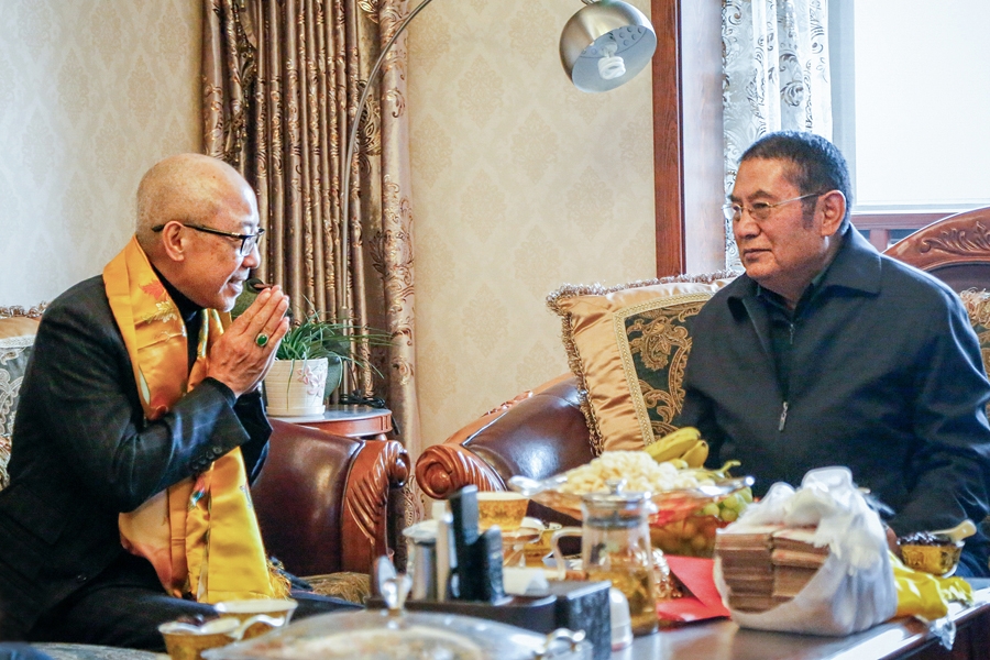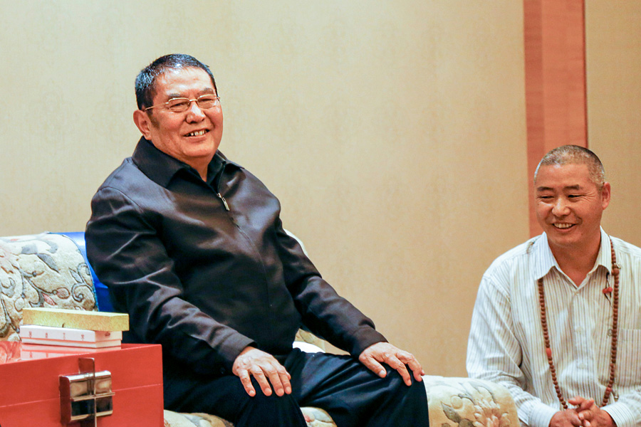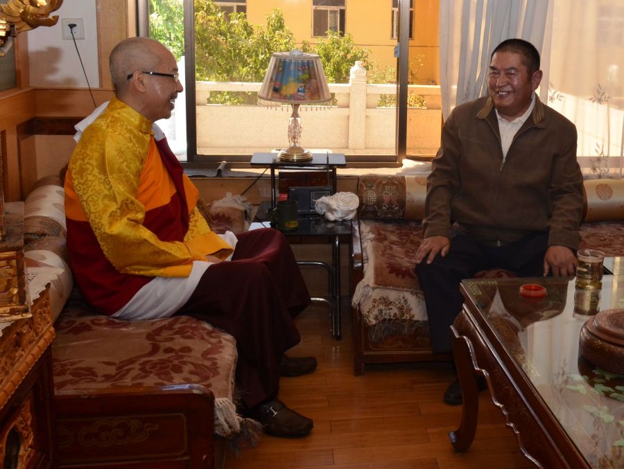 現居西藏拉薩市的 瓊贊法王(右),從小就對數萬名弟子傳法,深得眾人敬仰。2011年,仁波切帶領200多名弟子,前往西藏覲見 法王,法王對 仁波切的佛法事業非常關心,仁波切則極為關懷 法王生活,彼此臉上掛滿笑容。