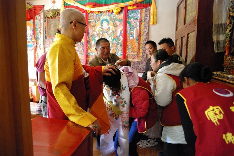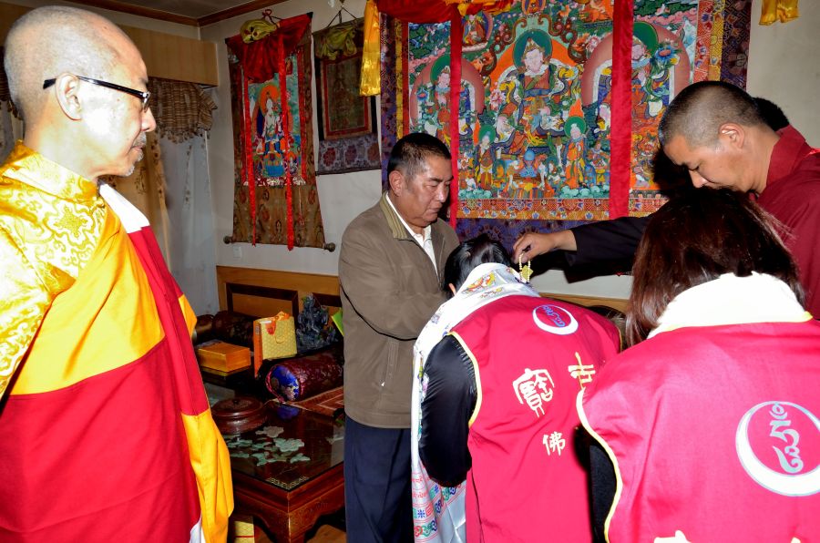 仁欽多吉仁波切先獻上翡翠項鍊表示敬意,寶吉祥佛法中心皈依弟子依序向尊勝的 瓊贊法王獻哈達,法王也以哈達、佛珠、金剛結、佛像墜飾和加持過的甘露水回贈每一個人。能得到具德的如法修行人之加持,是學佛者無上的榮耀與福報。