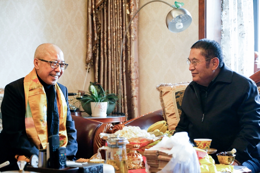 瓊贊法王提及兩個月前曾到臺灣故宮博物院觀賞《龍藏經》,因此特別垂詢《龍藏經》在臺灣刊印發行的緣起及經過,經由 仁波切詳細報告後,瓊贊法王非常歡喜。