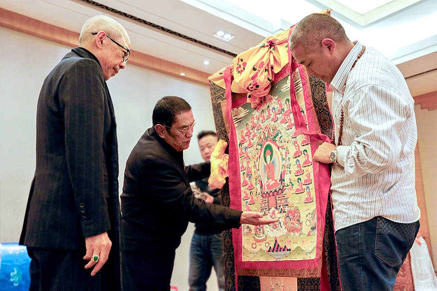 2016年11月在成都,尊勝的 直貢瓊贊法王在 仁欽多吉仁波切及南珠堪布(右一)的隨侍下,法王賜贈 仁波切一幅直貢噶舉的皈依境唐卡,並開示含意。