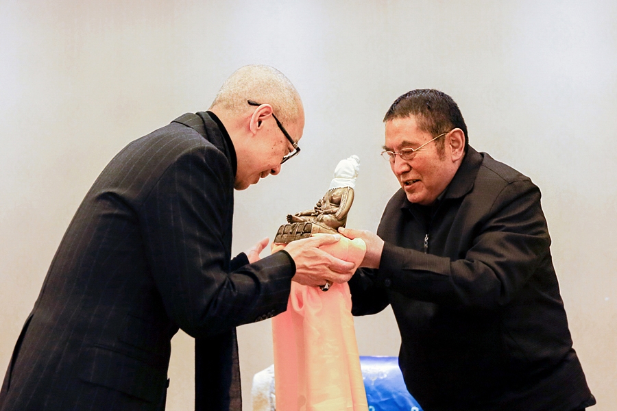 瓊贊法王又賜贈 仁欽多吉仁波切建造不丹鐵橋的唐通.杰布尊者聖像,以及今年直貢梯寺法王大法會的紀念品。