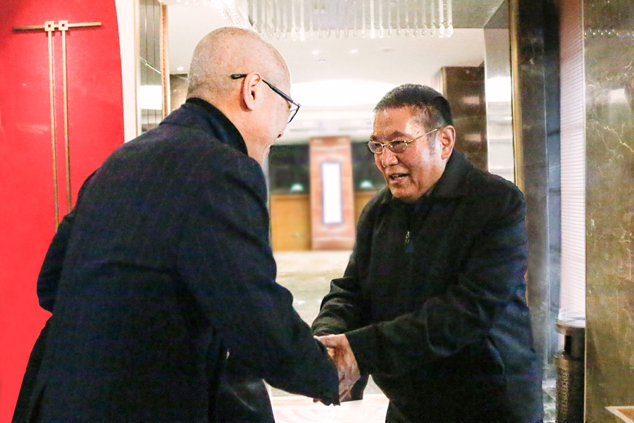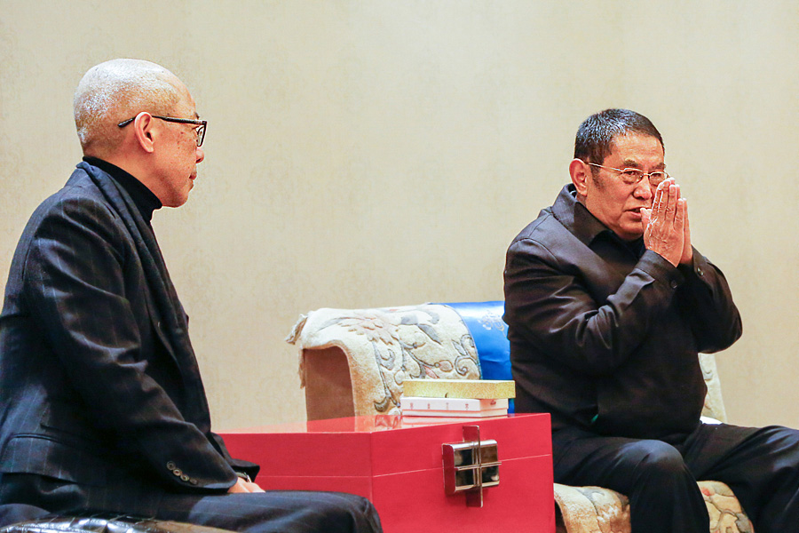 此次拜見過程中,仁欽多吉仁波切全程悉心侍奉及保護 瓊贊法王,仁波切對 法王的恭敬心溢於言表。結束後,瓊贊法王和 仁波切親切握手道別。
