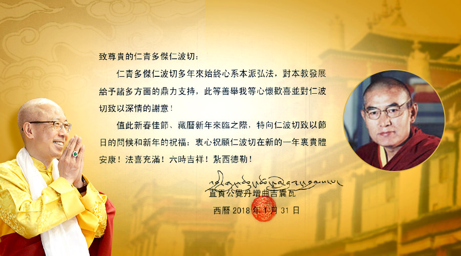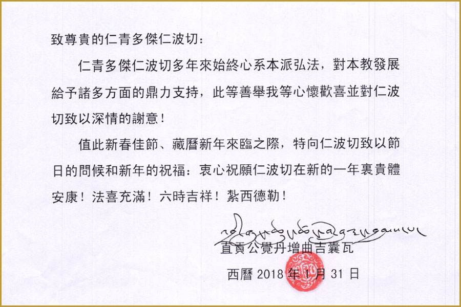 2018年新春伊始,直貢瓊贊法王特別自對岸來信問候 仁欽多吉仁波切,感謝 仁波切多年來一心弘法、全力護持教派,並祝福 仁欽多仁波切貴體安康、法喜充滿、六時吉祥。