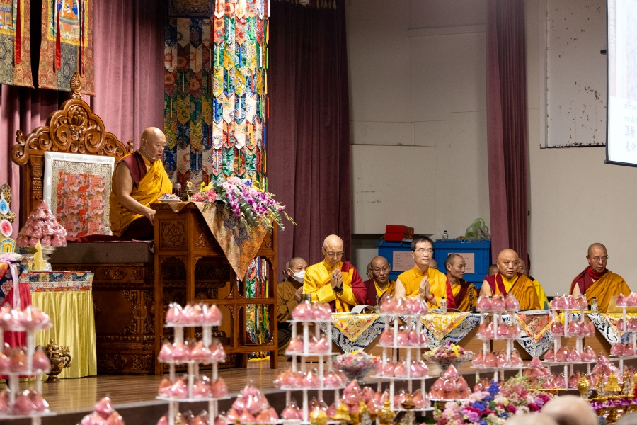 瓊贊法王並賜予寶吉祥弟子們哈達、唐卡及佛珠,仁波切則恭敬陪侍 法王身側,讓每一位弟子都能得到極為難得的加持機會。